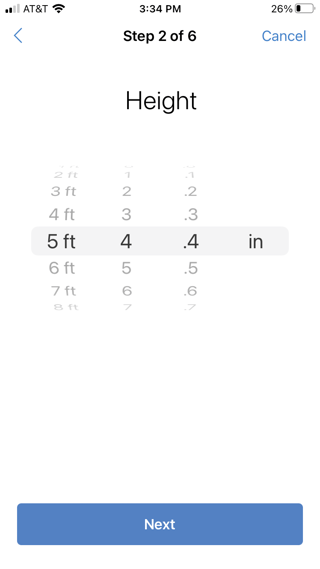 The height answer format displays a “drum” picker that lets the participant choose a height to the nearest decimal point. This can be set up to show in United States Customary or Metric.