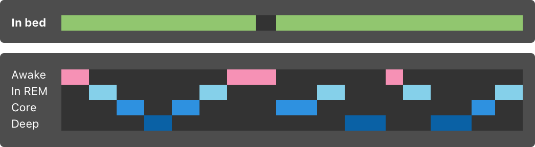 Apple HealthKit sleep data includes a few different data types. The iPhone itself can only track time in bed (value: InBed) while the Apple Watch tracks time asleep (Values: Awake, AsleepREM, AsleepCore, AsleepDeep) and also in bed.