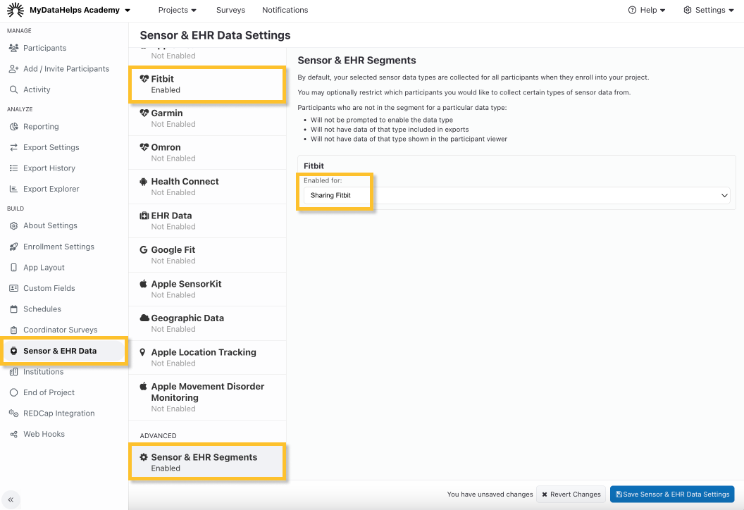 - Click "Save Sensor & EHR Data Settings" to save your changes. You can also click "Revert Changes" to undo your changes.