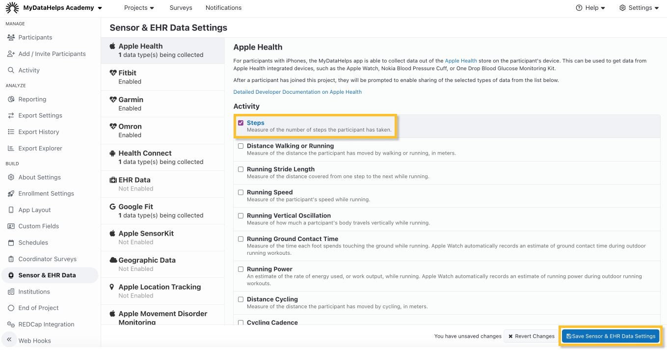 - Select a sensor data collection service (e.g., Apple Health, Garmin, etc.).