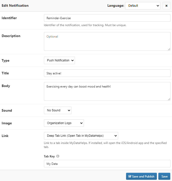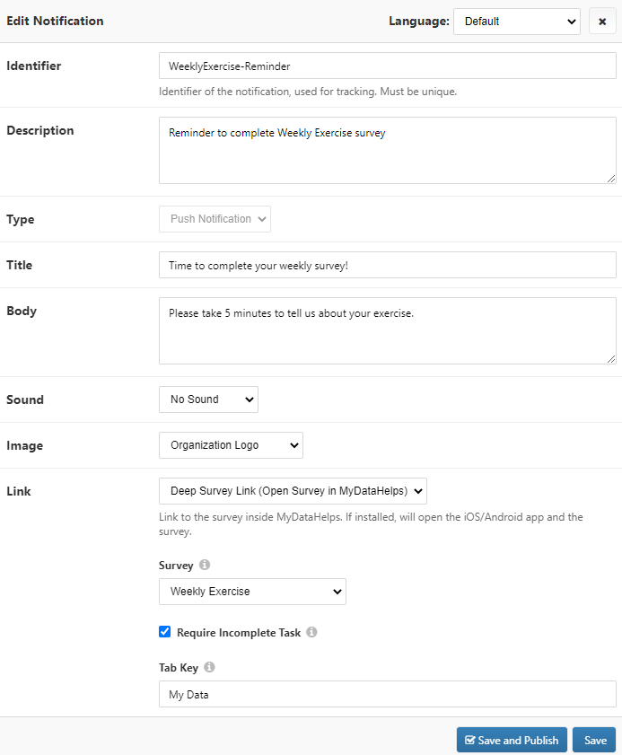 Deep tab links can be created by selecting a link type of “Deep Tab Link (Open Tab in MyDataHelps),” and the only field required is the Tab Key. For example, if you didn't have a weekly survey, but wanted to send a push notification encouraging participants to exercise, you could direct participants to the My Data tab upon clicking the notification to show them their device data.