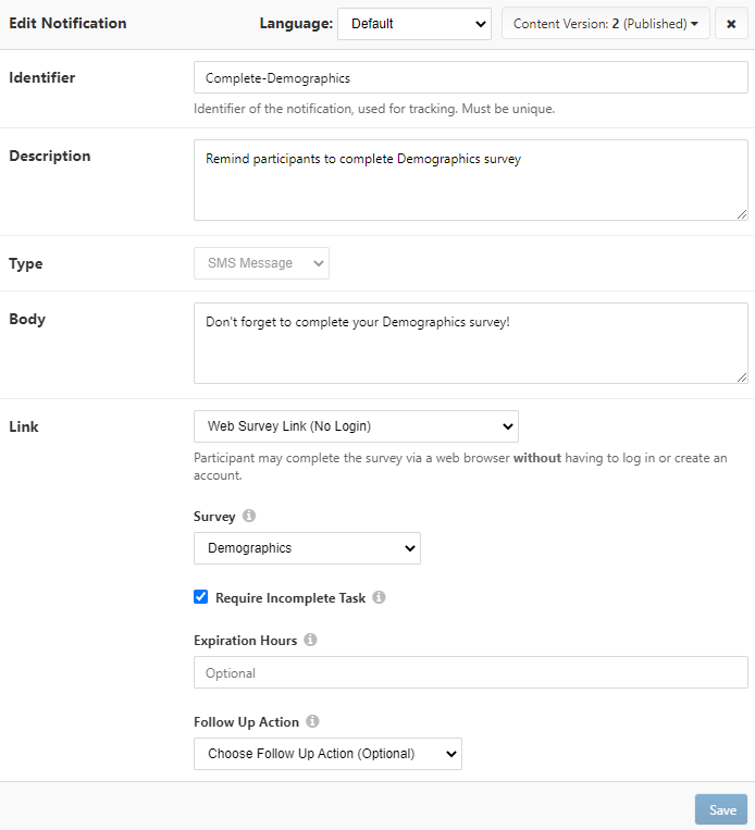 For example, to create an SMS notification that directs participants to complete a demographic survey via web: