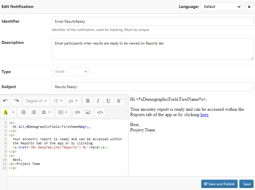 For example, to create an email notification using the Project Invitation email template that directs new participants to complete the Wellness Study consent survey via web and to register an account with the MyDataHelps app: