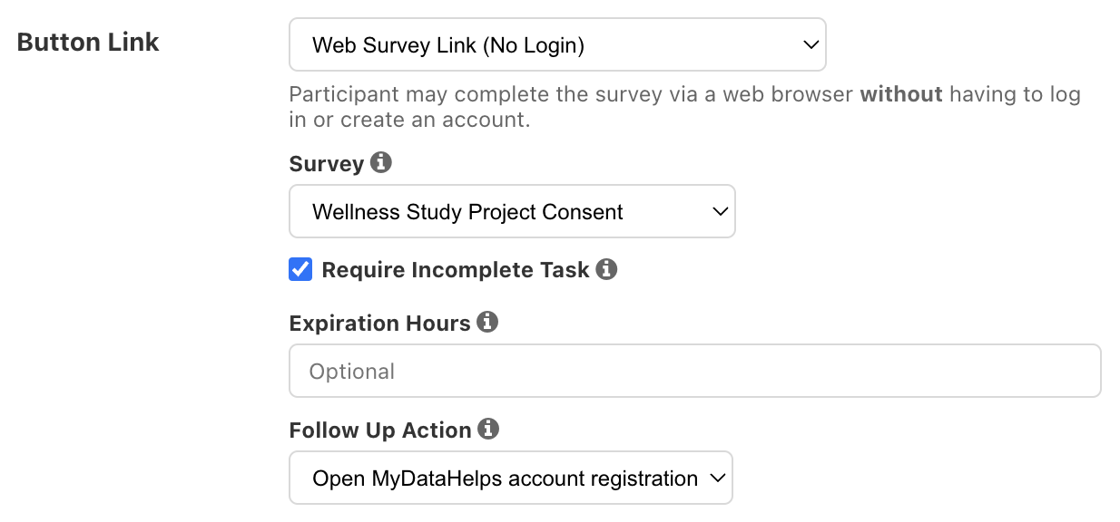 Use the “open MyDataHelps account registration” follow up action if directing participants to complete the consent survey via web before creating a MyDataHelps account.