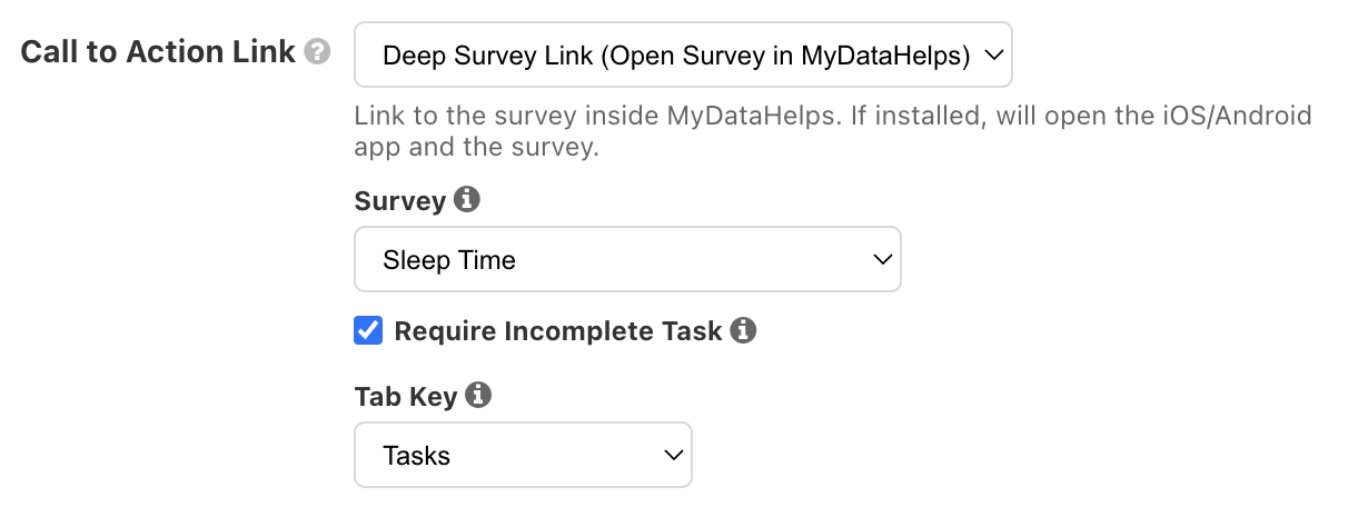 - Under Link, select “Deep Survey Link (Open Survey in MyDataHelps).”