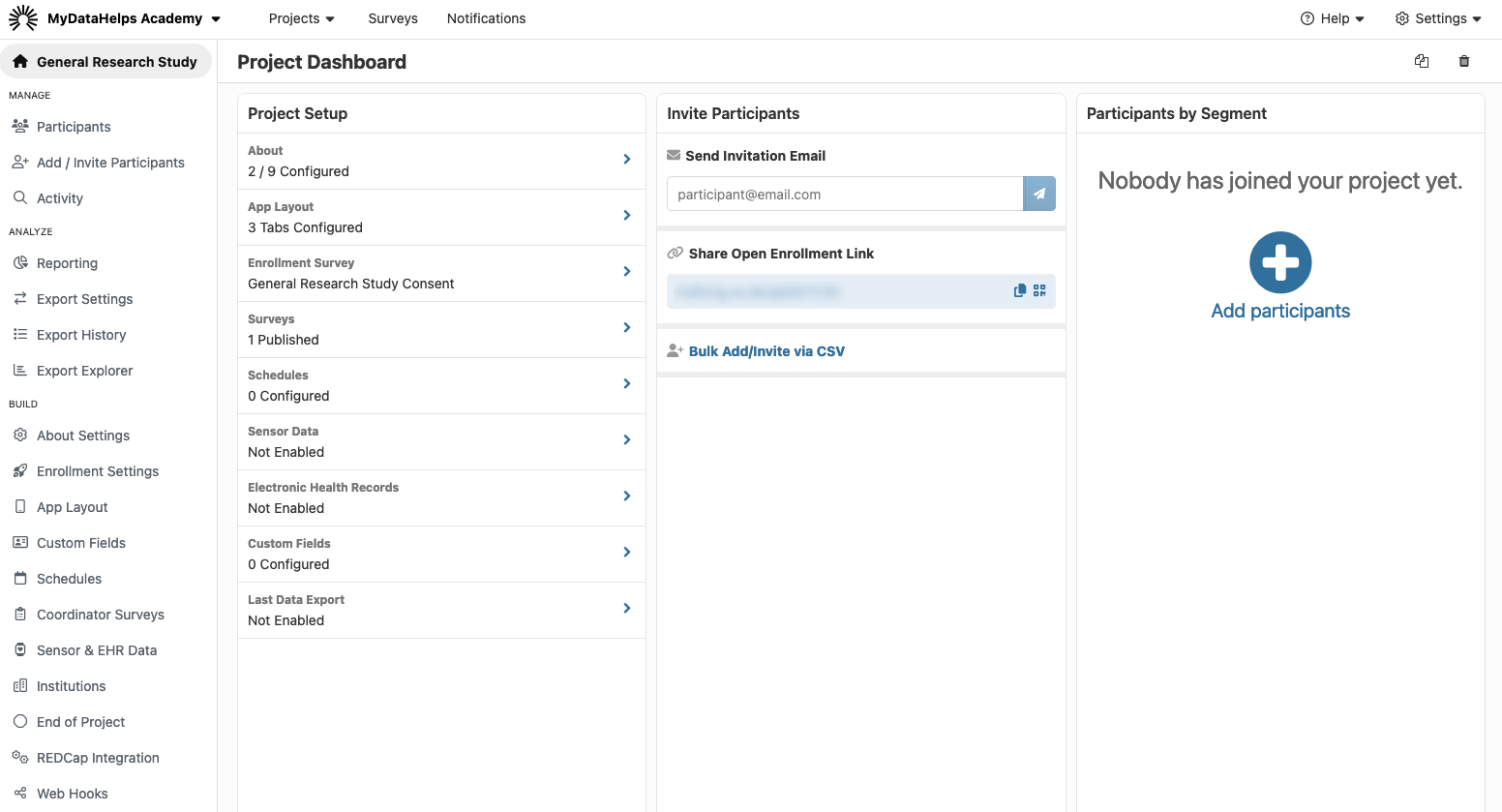 Upon creation, you will be taken to the project dashboard, where you can navigate to various project settings, try out your project, or add participants and segments.
