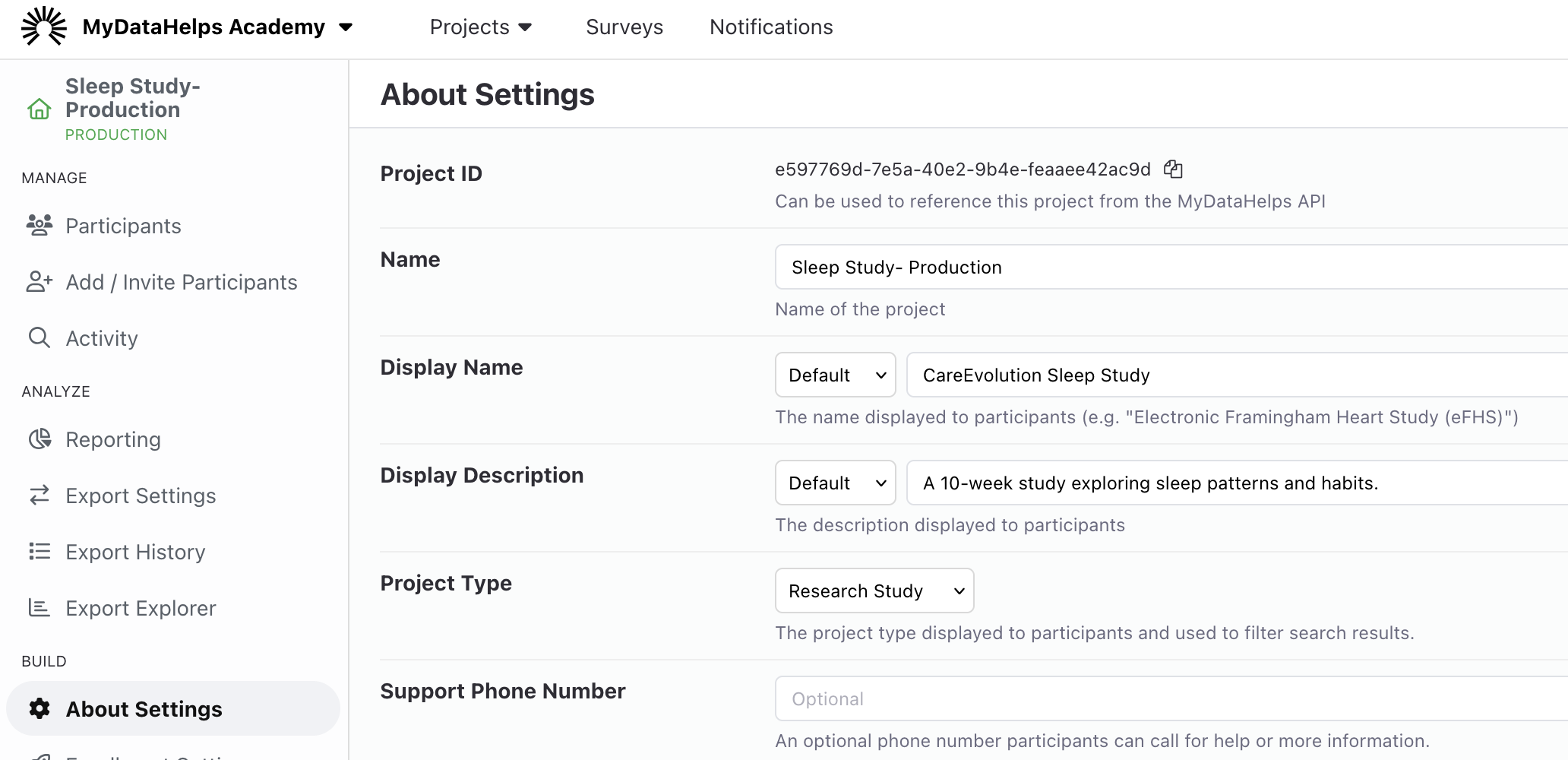 On the About Settings tab, the project can be renamed by editing "Name". This is an internal name for your project. If you wish to change the participant-facing project name, edit the "Display Name".