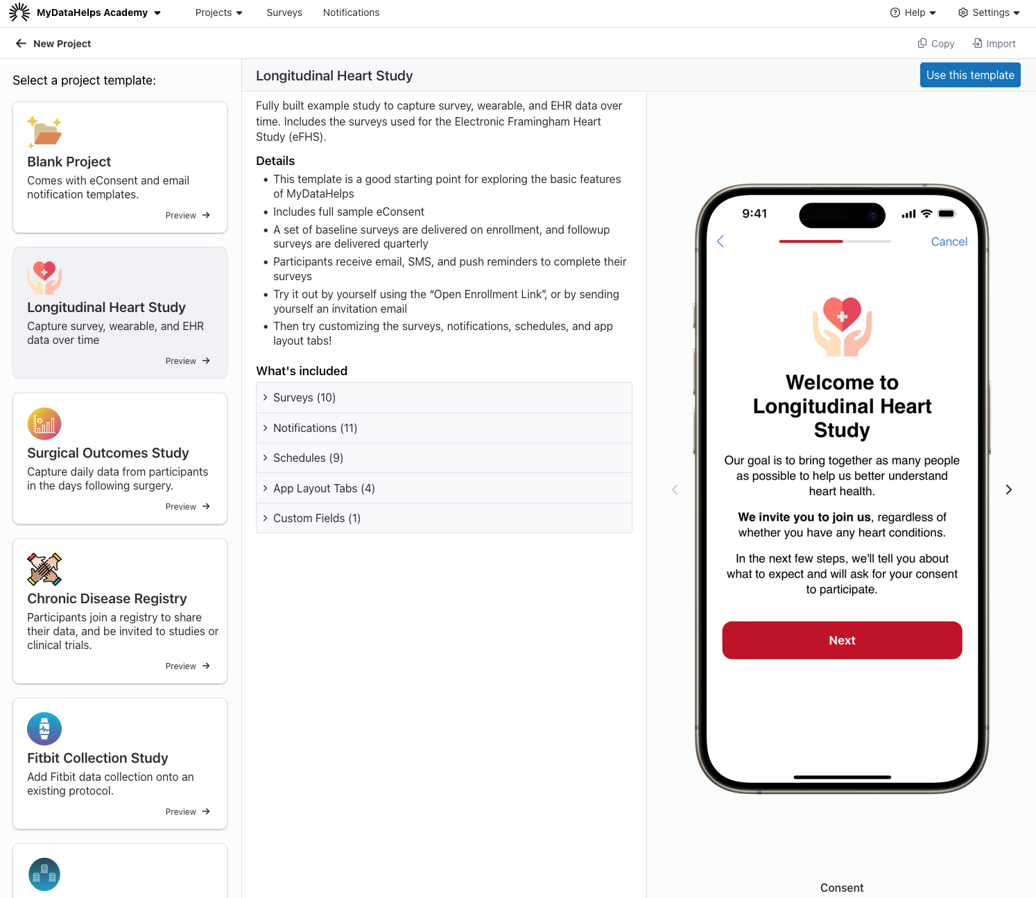 When creating a project, you'll need to choose a template. Templates quickly allow you to jumpstart your project configuration by including standard surveys, notifications, schedules, app layout tabs, and custom fields. If you'd like to start from scratch, you can select the "Blank Project" template option.