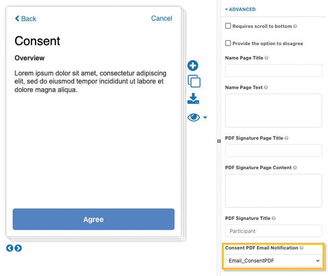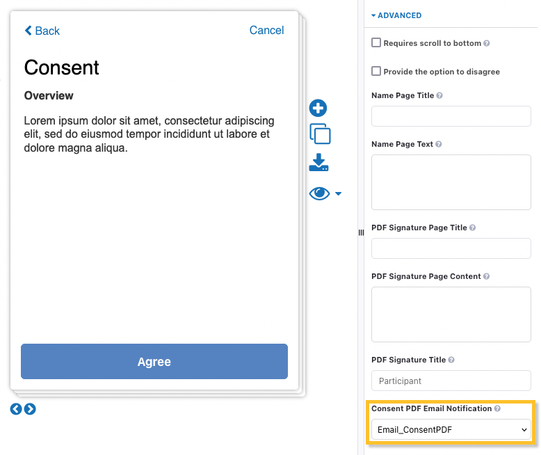- Consent PDF Email Notification: You can elect to have participants receive a PDF copy of the consent using one of your published email notifications.