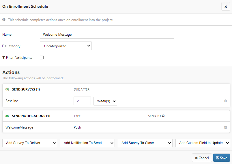 For example, you could create a schedule to send a baseline survey immediately upon enrollment to all participants. Further, you could create a schedule to send a "Congratulations!" push notification to participants upon completion of the baseline survey.