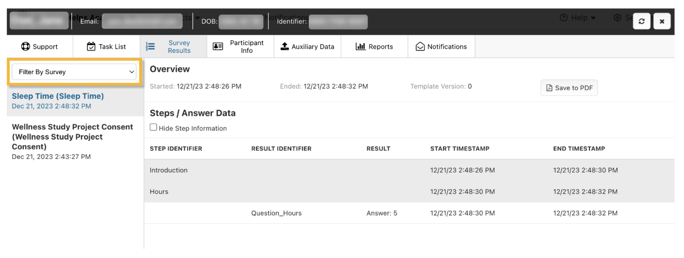 After addressing participant experience and data labeling, create a test participant and ensure the survey functions as expected. Invite yourself using a test email address, complete the survey, and then check the Survey Results on the Participant page. This testing phase helps identify any issues with data collection or survey completion before sending it to real participants.