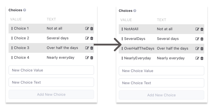 In addition to assigning unique identifiers to steps and forms, it's essential to label each answer choice with a distinct value, when utilizing Text Choice as an answer format in your survey. These answer choice values play a crucial role in survey response analysis, aiding in the interpretation of participants' answers. Similar to step and form identifiers, avoid using default labels like "Choice 1" or "Choice 2". Instead, add descriptive values that provide clear context when reviewing participant responses.