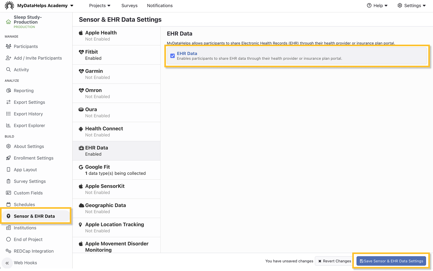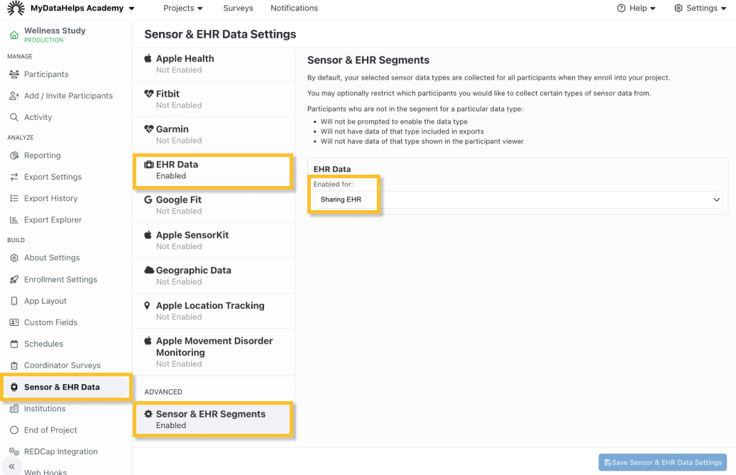 - Navigate to the Sensor & EHR Data tab on the left-hand project menu.