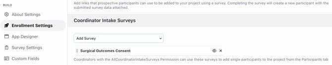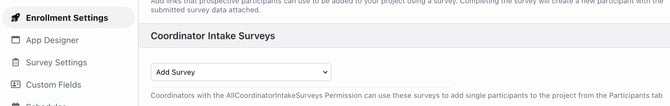 Or on the Enrollment Settings tab, by clicking on Add Survey drop-down within the Coordinator Intake Surveys: