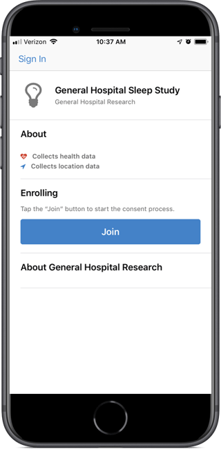 - Launch MyDataHelps on the shared device. You will be taken to the about/enrollment screen of the project configured in the application settings.