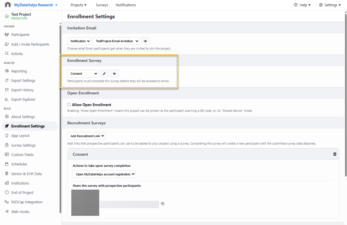 In addition to the configurable enrollment methods mentioned above, each project has a default enrollment survey assigned. Participants are required to complete this survey as part of the enrollment process.