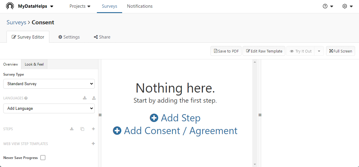 If you choose to create a consent survey from scratch, you will arrive at the following page. Start by clicking "Add Consent / Agreement".