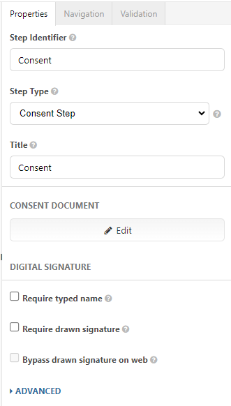• Step Identifier: Already populated as "Consent" and is used as an internal way to reference this step. You may revise the name.