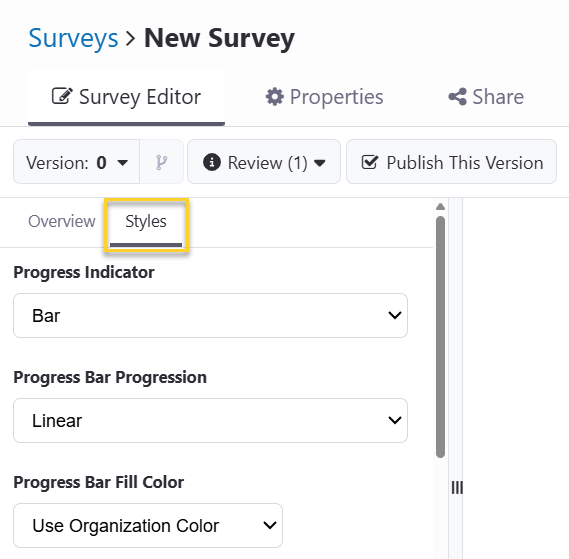 In the left pane of the survey editor is the survey-level "Styles" tab. These settings apply to the entire survey.