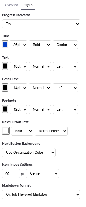 - Color, font size, font weight, and alignment of step titles and text.