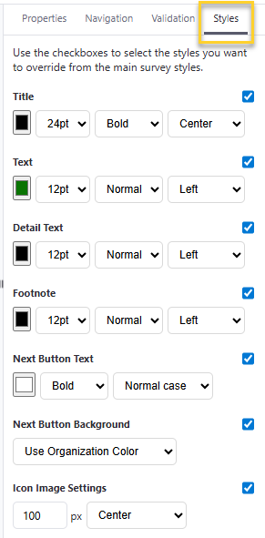 You can customize several aspects of a survey's font and color scheme using the "Styles" tabs within survey designer. Settings include: