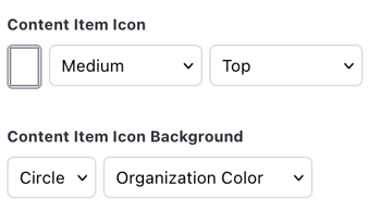 The Content Item Icon allows you to control the icon's color (using a color picker), size (medium or large), and positioning (top or middle). The Content Item Icon Background allows you to control the icon's background shape (none or circle) and color (organization/workspace color or select from the color picker). For example, if you wanted large, light yellow icons on a red background in the middle of your content item, you could do: