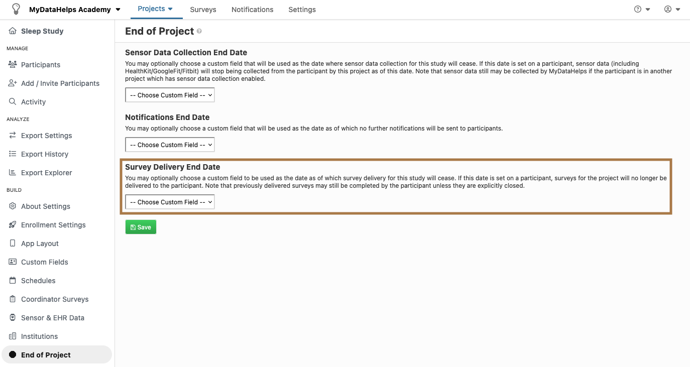 To begin, you will first need to create a custom field with a data type of Date or Timestamp, which will be used to store the study end date for each participant. This date or timestamp is the point at which activity will cease. We recommend using one of the following naming conventions for this custom field:
