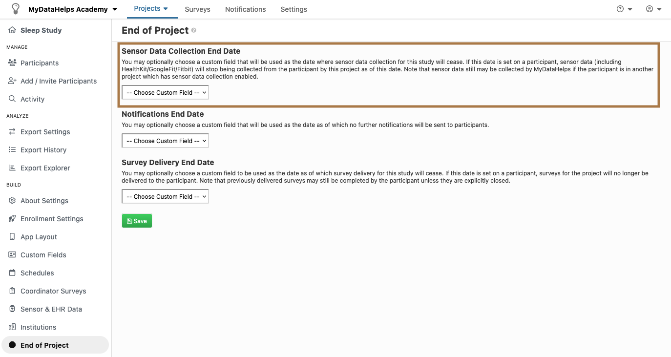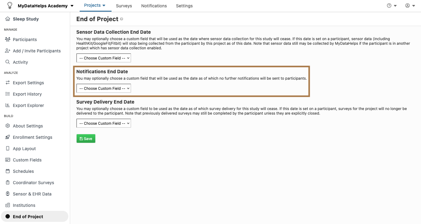 - SensorDataCollectionEndDate: Use this if multiple end of project events should occur at different times (for example, if you want to stop notifications a week before stopping sensor data collection).