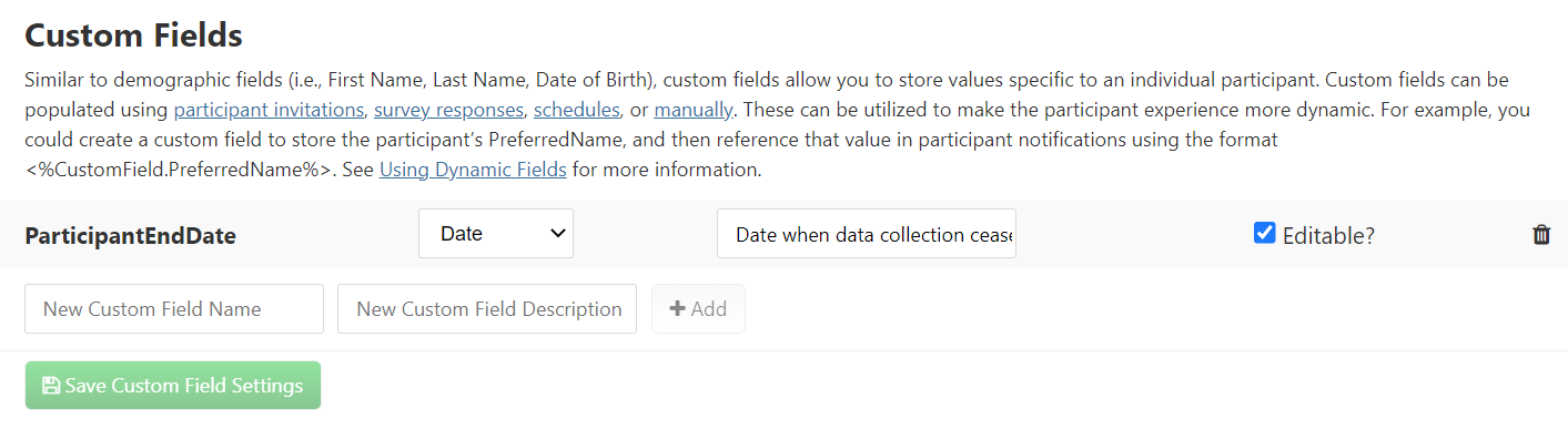 Finally, you will need to determine how you will define this value for each participant (i.e. will all participants have the same end date, will the end date vary based on the enrollment date, etc.). Instructions on how to set this custom field can be found under Populating Custom Fields.