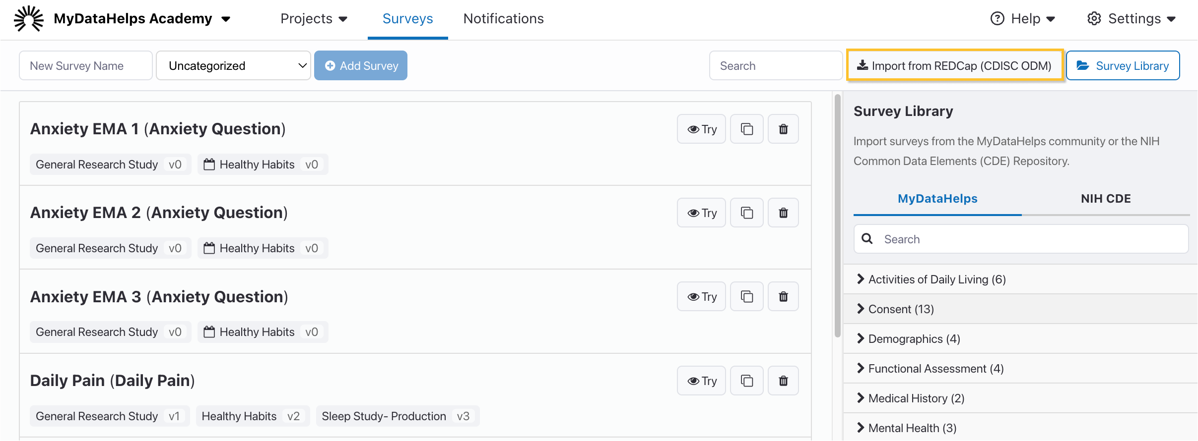 MyDataHelps Designer makes it possible to import surveys from Project REDCap. Watch this quick video to learn how you can best leverage your existing projects and instruments in REDCap with MyDataHelps:
