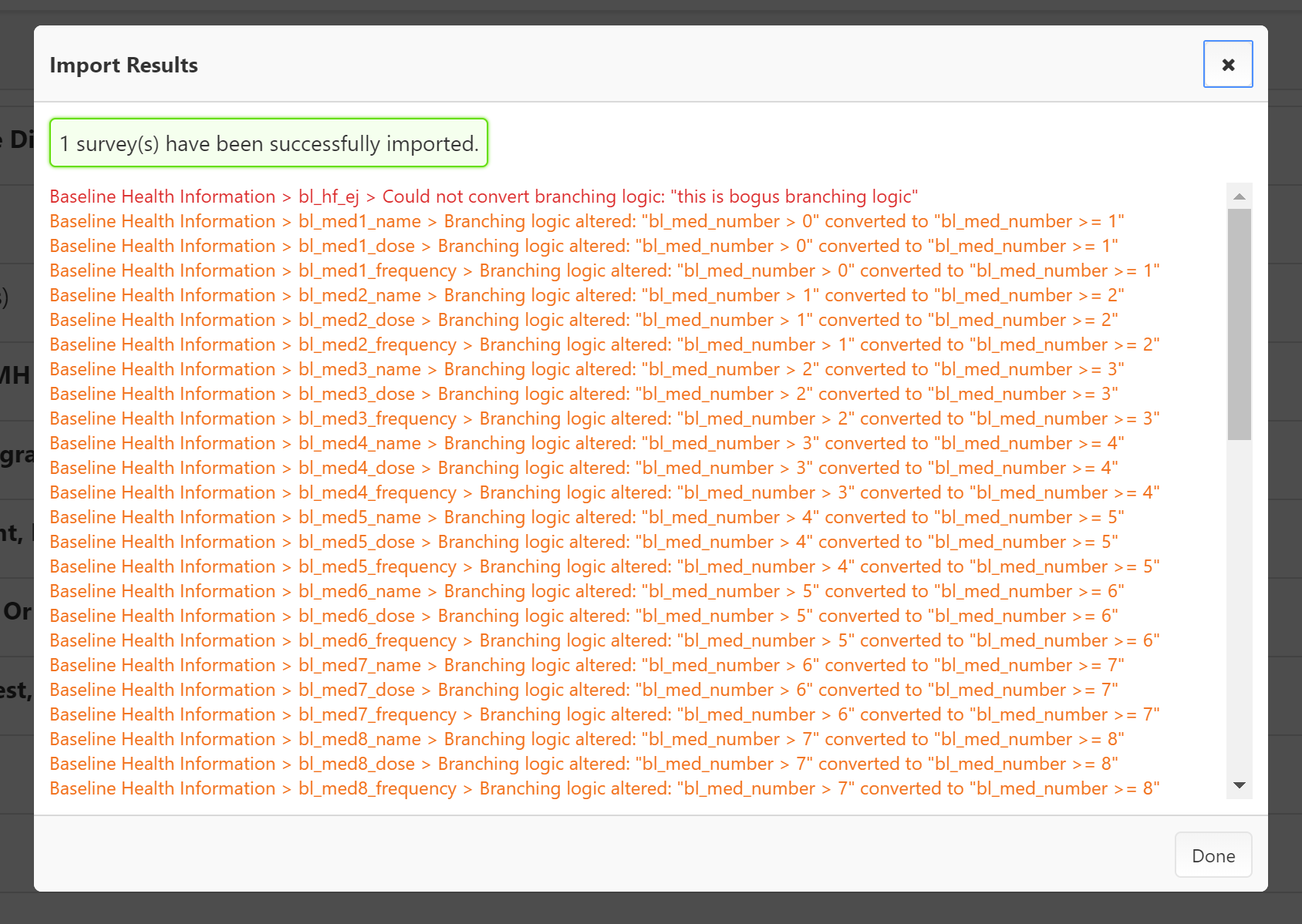 After the import, you will be alerted to any instances where the survey could not be transferred exactly, and what was done instead. You will need to review this list and make manual adjustments as necessary.