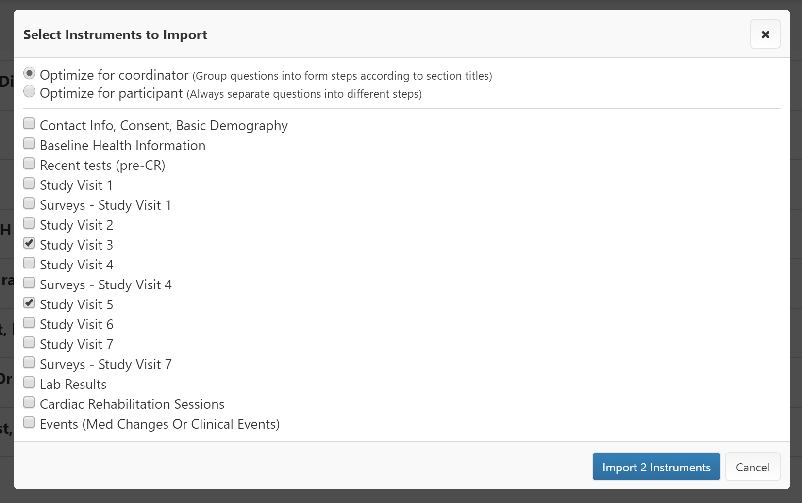 - Select the REDCap instruments you wish to import. Each instrument will become a new survey in MyDataHelps Designer. See Optimization below for information on the optimization options.