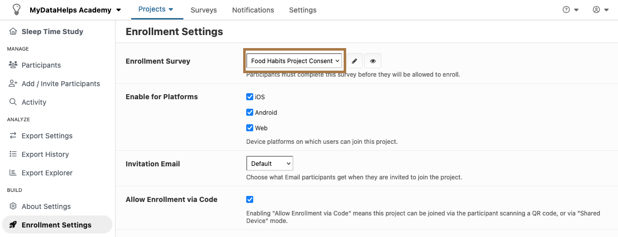 Each project requires a “Consent” survey to be configured before participants can join - this can be used to inform the participant about how their data may be used, assess eligibility, collect initial data, or any other things which you might want the participant to see or do before joining.