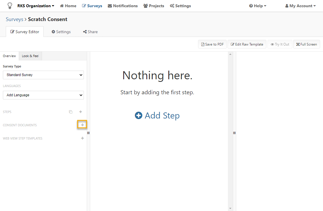 On the left side of the survey editor, below the list of steps, is a header for consent documents. Select the “+” button next to the header to add a new consent document.