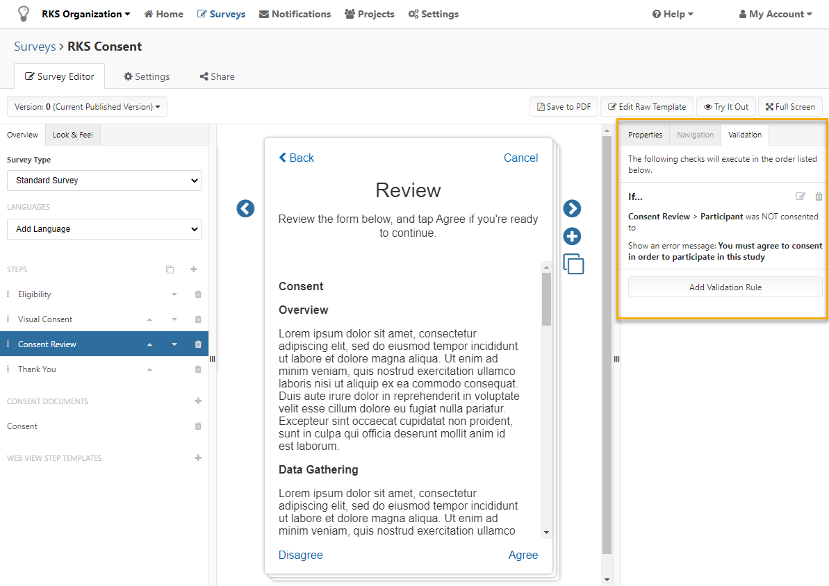 If you do not add validation rules to this step, participants will be able to enroll even if they disagree to the consent.