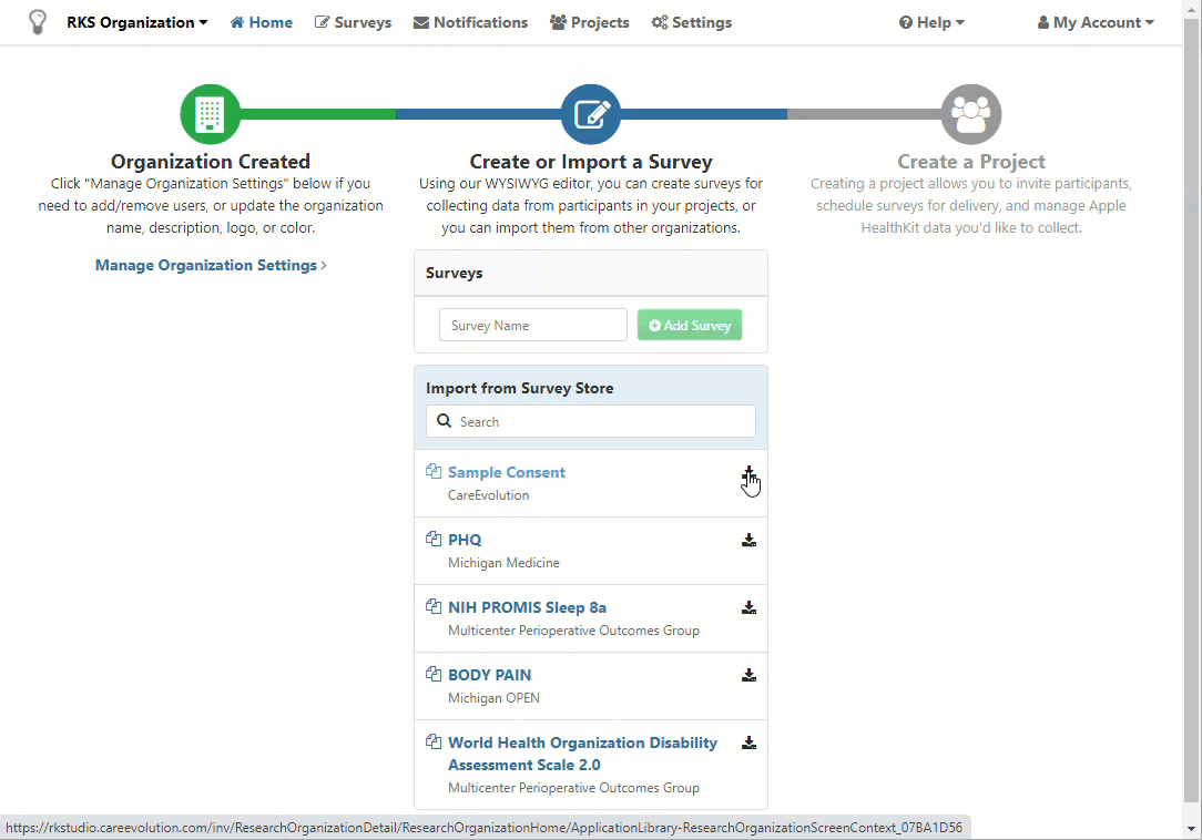Consent surveys can either be created from scratch, same as creating a standard survey, or you can download the Sample Consent from the survey store. To download the survey, click the download icon on the homepage, enter a survey name, and click Import, as shown below.