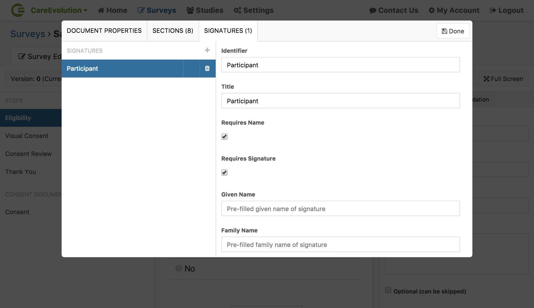 To record an electronic signature with a Consent Review step, you must configure a signature for your consent document. These are visible via the “Signatures” tab when editing a consent document.