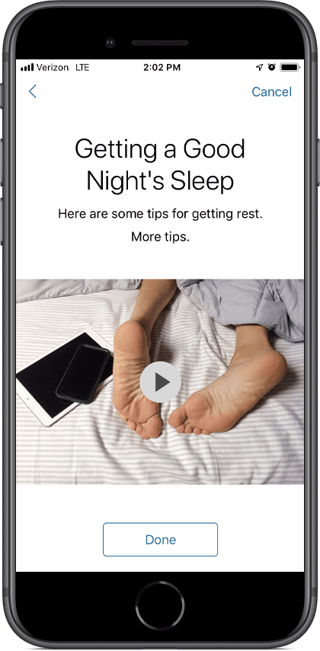 Text | Accessibility voice-over text for the capture button. | Watch this video to get some tips on healthy sleep habits. |