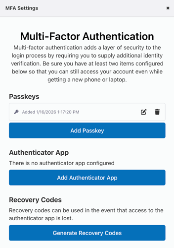 Here you can add or remove passkeys, add or remove an authenticator app, and generate new recovery codes.