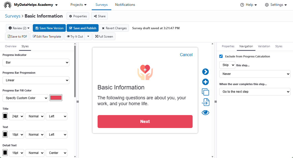 | Finish Survey -> Cancel and Save | A target step that saves the participant’s responses from previous steps and closes the survey. If the participant returns to the survey at a later time, their saved answers will be pre-populated. |