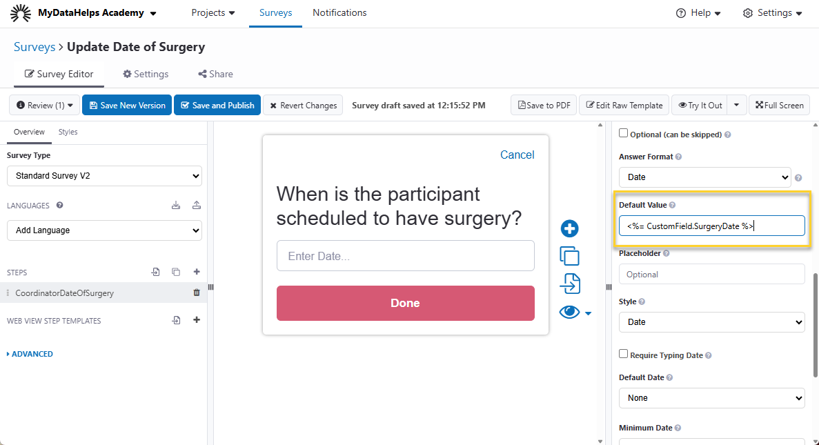 Additionally, piping can be used to display a default value in a survey step. For example, if you want to allow the coordinator to review or update the participant's surgery date, you may wish to default in the existing value for the surgery date: