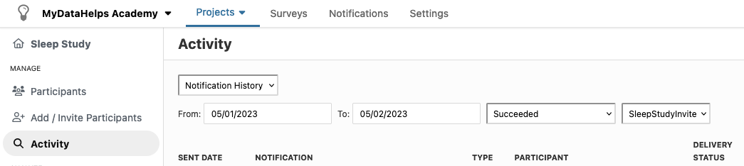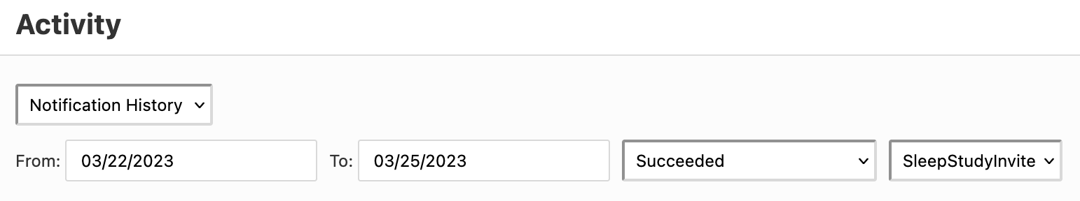 While sent notifications (email, push, and SMS) can be viewed within a participant's notification tab, you may wish to view sent notifications across the entire project. From the drop-down on the Activity tab, select "Notification History" and filter the date range, notification status (e.g., succeeded), and notification identifier (i.e., the notification's name within the Notification Library). For example, the below screenshot will show all baseline survey reminder notifications that were successfully sent between 3/22/2022 and 3/25/2022.