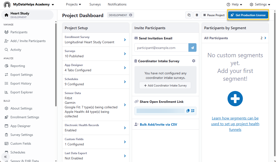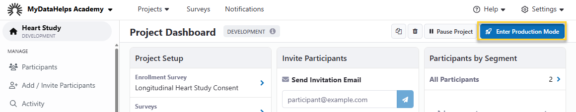 You will need a Production License before you can promote your project to Production Mode. Follow the Get Production License instructions within MyDataHelps Designer or contact us. See "Promoting to Production Mode" below for further details.