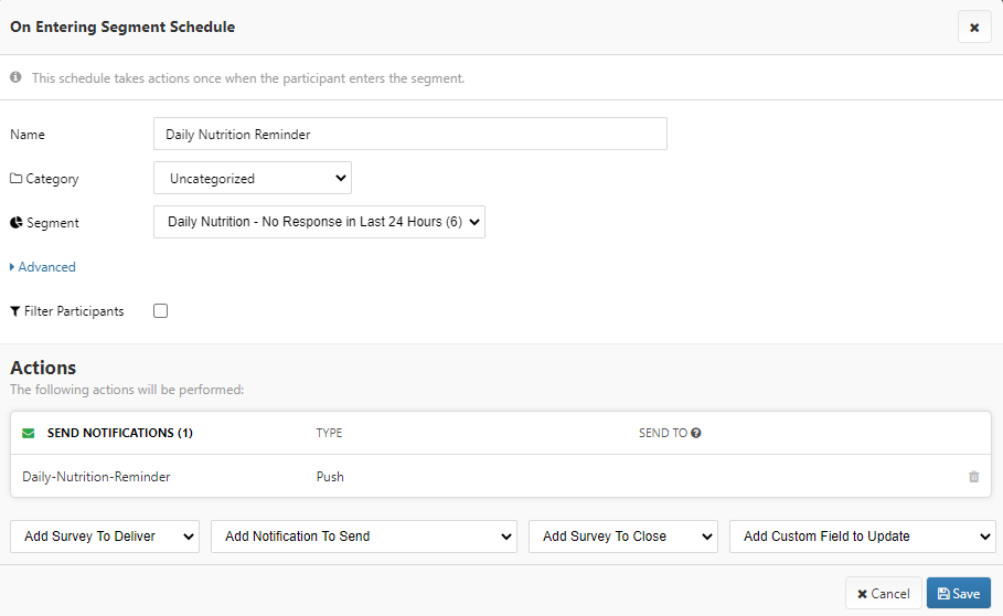 The “On Entering a Segment” schedule type will perform the specified schedule action(s) whenever a participant satisfies the logic criteria defined by a previously created segment. For example, you may wish to remind participants to submit a daily nutrition survey if they have not submitted a response in the last 24 hours.