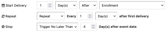 - Repeat: For applicable schedule types, you can enable a schedule to repeat for a certain duration or indefinitely. It is important to note that the Repeat value is relative to the first delivery, while the Stop value is relative to the event date. In the below example, the schedule will run one day after enrollment, and repeat every day until 4 days after the enrollment date, for a total of 4 triggered timepoints.