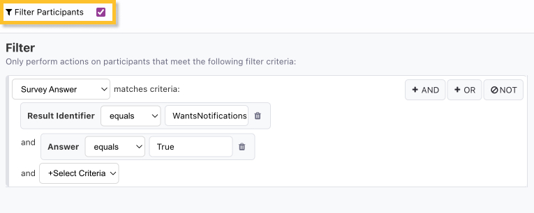 [note]When "Participant's Time Zone" is selected, the time zone is continually updated as participants access MyDataHelps on mobile or web. If a participant is traveling to a different time zone, they must open MyDataHelps in order for the schedule to update based on their new time zone. Keep this in mind for notification schedules in particular. For example, if a participant from EST travels to MST for a week and they do not open MyDataHelps during that time they will receive notifications in EST. However, if they do open the app while traveling they will receive notifications in MST. [/note] - Filter Participants: For all schedule types (except “On Meeting Criteria”), you can define filter criteria that participants must meet in order for the schedule to trigger. For example, you may only want to send a notification to participants who answered that they want to receive notifications. To accomplish this, you can filter your schedule for participants with a survey answer indicating they want notifications.