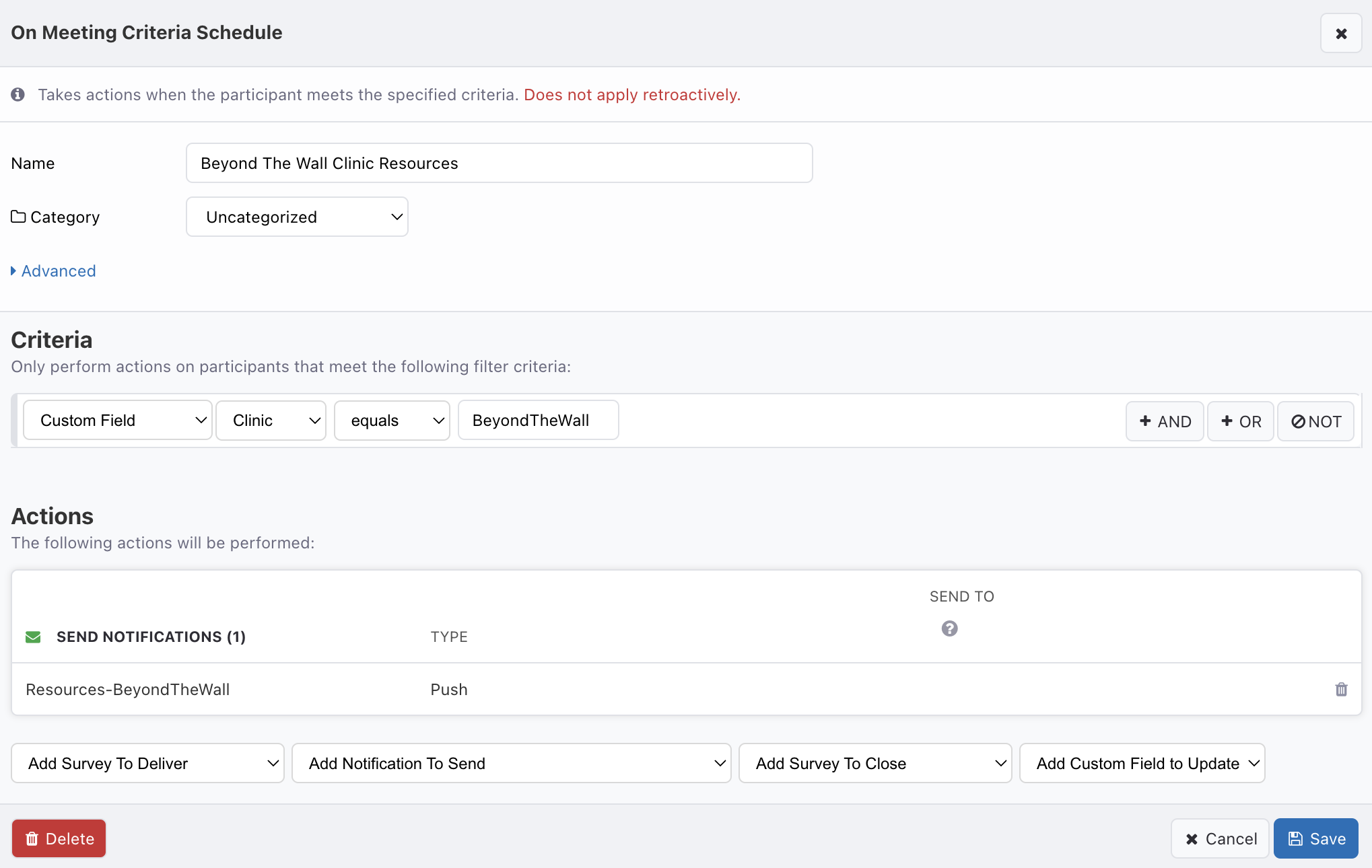In the example below, the schedule will send the Resources-Beyondtheall push notification to participants when their Clinic custom field is updated to "BeyondtheWall".
