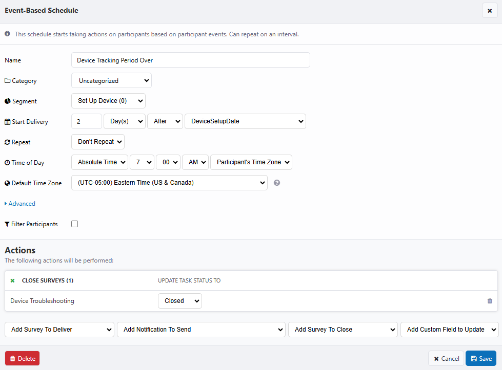 In the example below, starting at 7:00 AM (participant's local time), 2 weeks after their DeviceSetupDate, participants who set up their devices can no longer access the DeviceTroubleshooting survey.