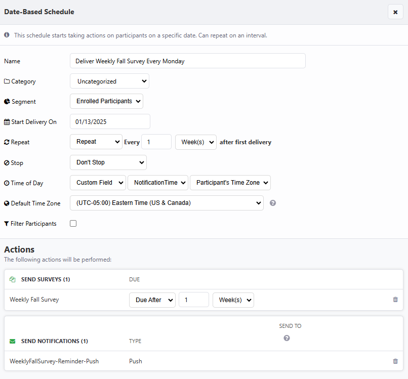 In the screenshot below, enrolled participants should receive a weekly survey and notification every Monday. To accomplish this, we've set the schedule to start delivery on a Monday date, and repeat every week. Additionally, for this example, let's assume participants are able to set what time they'd like to receive the survey and notification via a survey question that is saved to the NotificationTime custom field. To trigger the schedule at this time, specify the Time of Day field to use the NotificationTime custom field in the participant's local time zone.