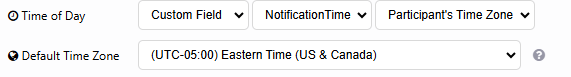 - Time of Day: For event-based and date-based schedules, select the time of day to trigger the action. You can either choose to trigger the schedule at an Absolute Time (i.e., the same time for everyone - in either a fixed time zone or respecting the participant's time zone) or a Time of Day custom field (i.e., the time of day the schedule triggers is specific to the value of the specified custom field for each participant).